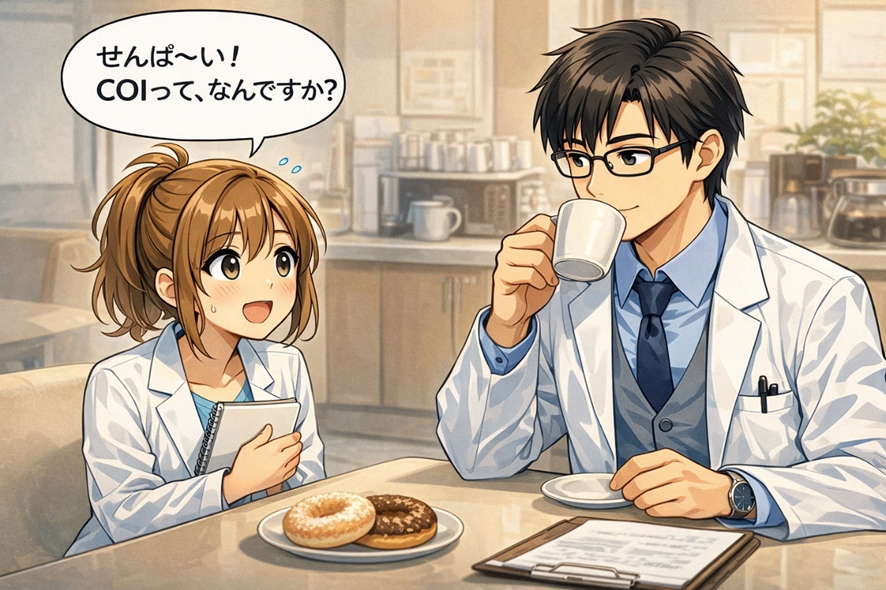 早乙女ヒカルは既に論文投稿の経験はあるのですが、今回、海外雑誌への投稿を進めていたところ、ガイドラインに記載されていた”COI”について少し気になったようです。学会の規程もあまり読む気もしなかったので、いつものように手っ取り早く教えてもらおうと、ちょうどコーヒーブレイク中の先輩、藤堂京一郎に声をかけました。
