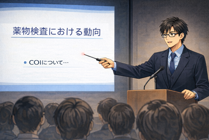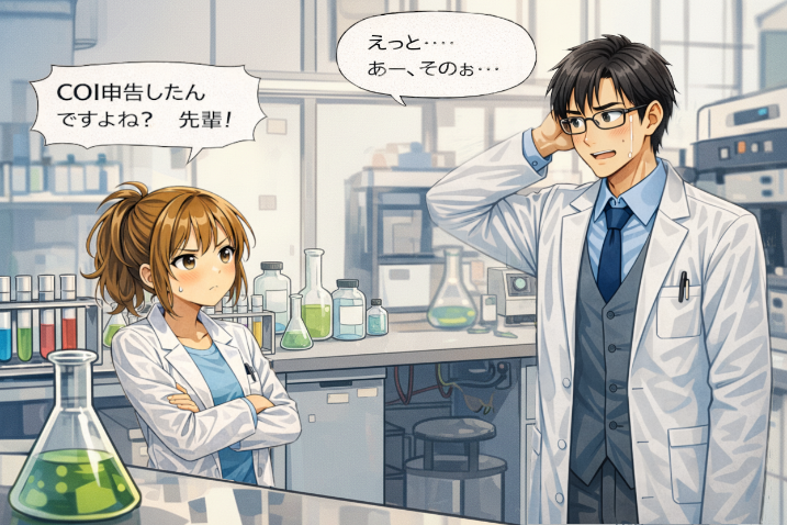 「早乙女は研究報告の中で、新しい試薬を使っていたよね? その結果、良い成果を出していたけど、質疑応答の際に、フロアからその試薬の価格について質問あったよね?その時、早乙女は『○○企業から提供を受けているので、正確には分かりませんが、結構高価だと聞いています。。。』、っていうような返答したよね? それに加えて、専用の測定装置も○○企業のを使っていたよね? でも、たしか、発表スライドの冒頭で、“COIに関し自己申告すべき内容は無し”、と表示していたよね? これって本来はまずいと思ったんだよ。」
