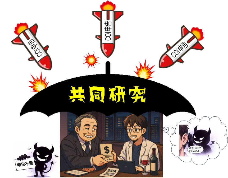 『うわっ、なんか、おどろおどろした恐ろしい絵柄ですね!? この絵が意味しているのは、本当は利益供与を受けて、その見返りとして相手側に有益なデータを渡している、って状態にもかかわらず、”共同研究”という傘(隠れ蓑?)の下にいれば、“COI申告・開示から逃れられるよ!”っ的なことですか?』