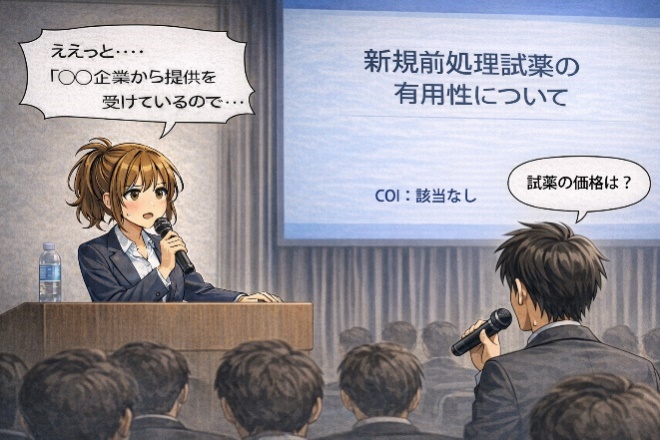 「何度も言うけど、COI開示は自己申告で本人の責任で行うものだから、それは仕方ないのさ! 今回のケースであれば、通常は大きな問題になることはないけれど、これが例えばCOIがあって、故意に利益供与をしてもらっている企業に有利なデータを発表したりしたら、その場合には大問題になるけどね!」